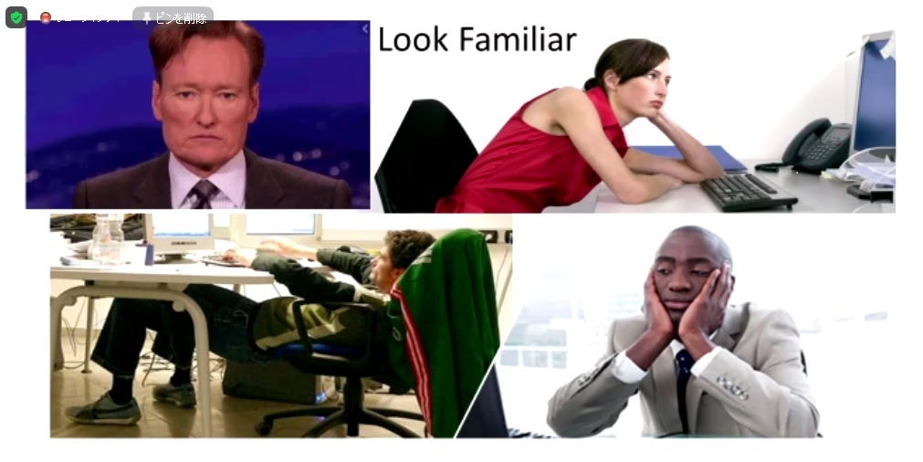 私は「ごめん、さっきまで別のこと考えてたんやけど、3人だけのブレイクルームに放り込まれたら、プレゼンス(存在感)がいやがおうでも95%ぐらいに上がるわ」と笑いながら打ち明けました。